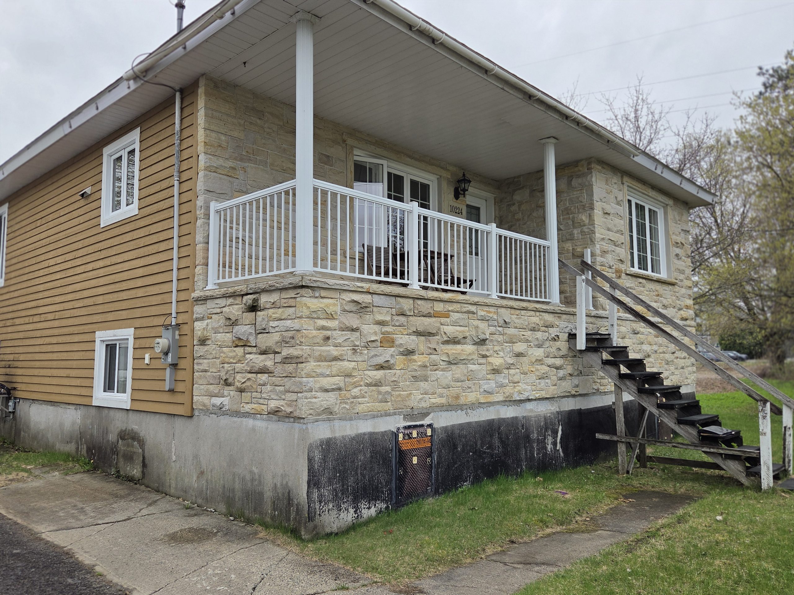 Revêtement extérieur retiré, la maison a été levée de 4 pieds et un mur nain a été posé en bois,