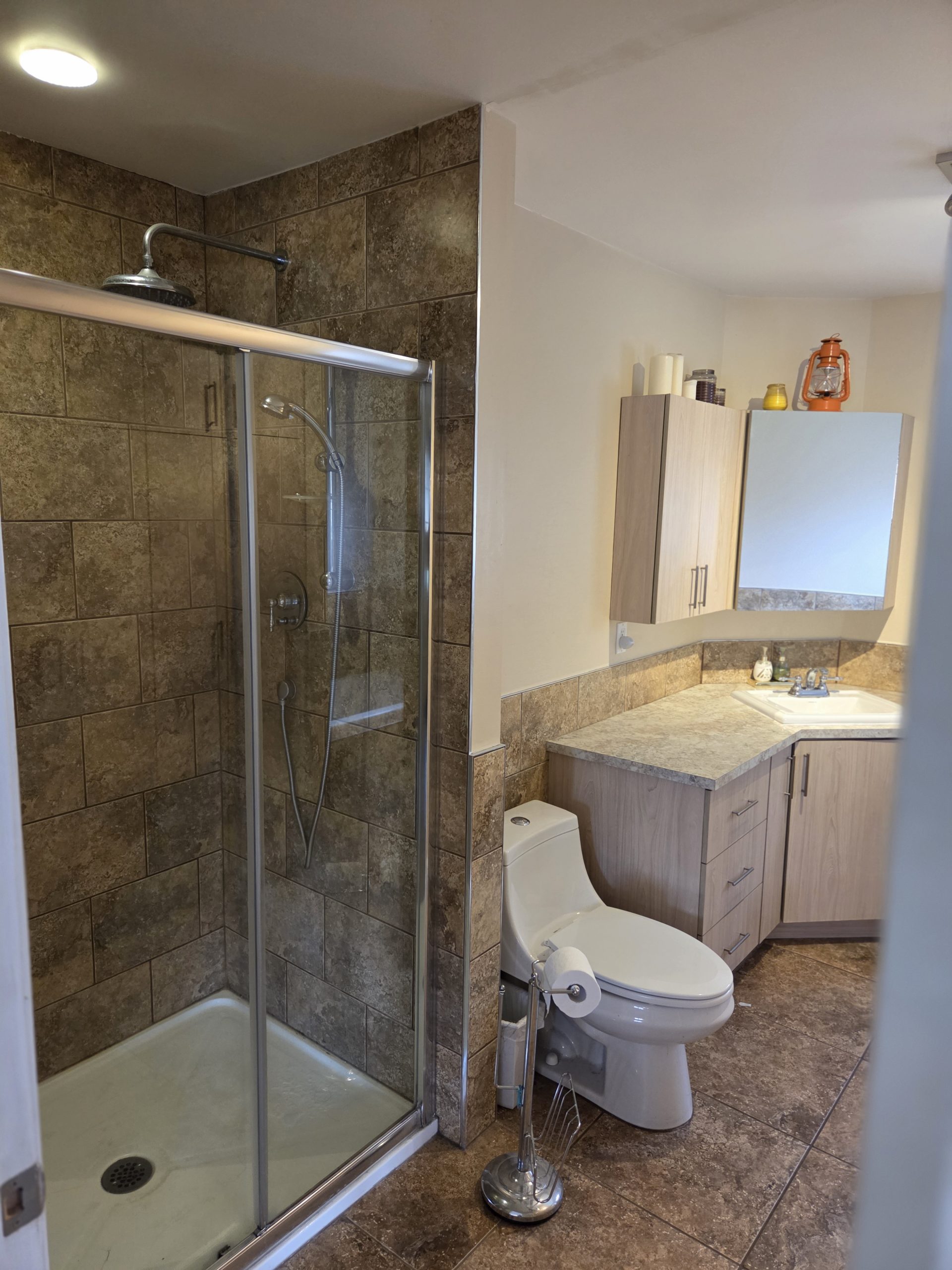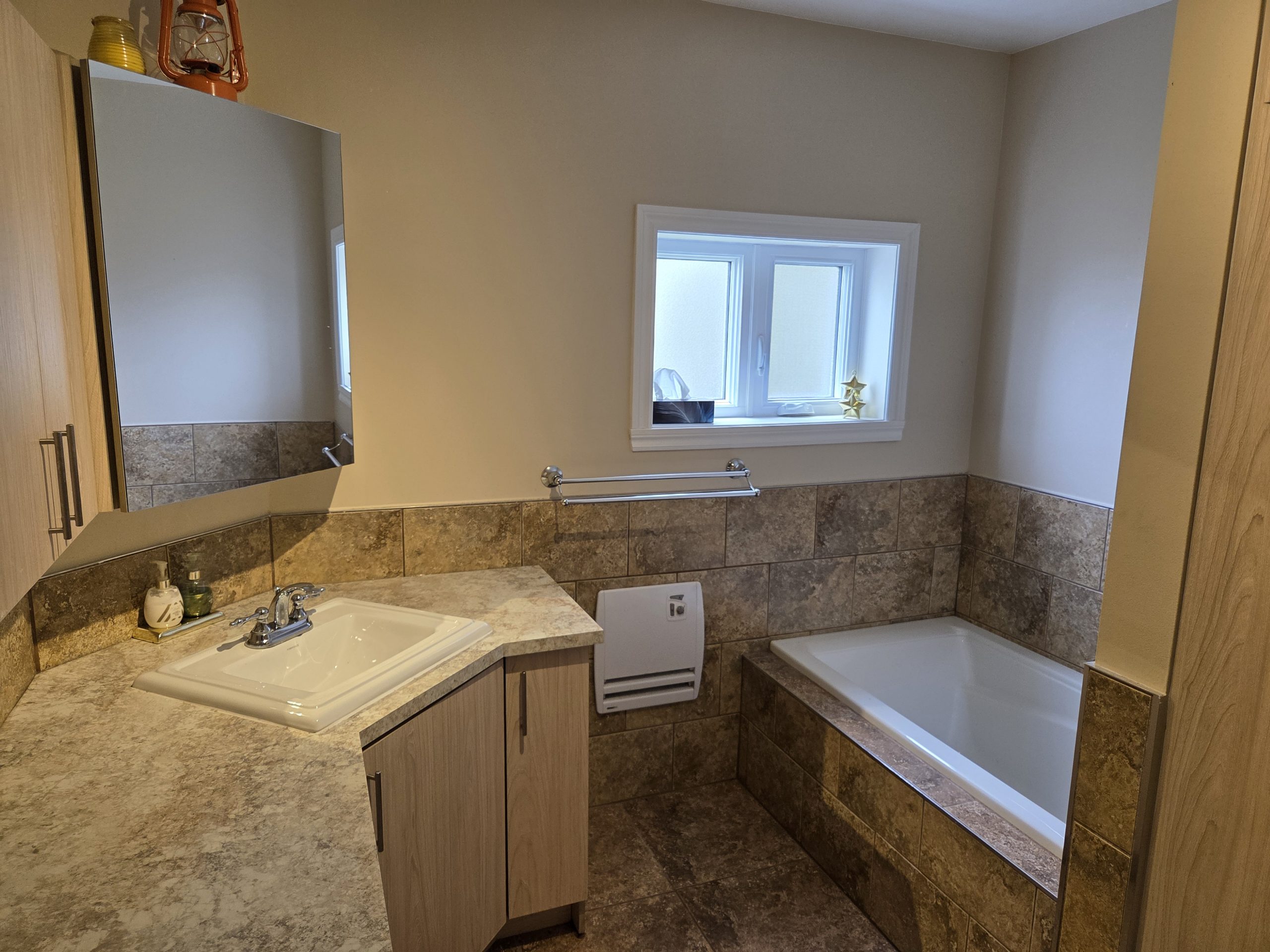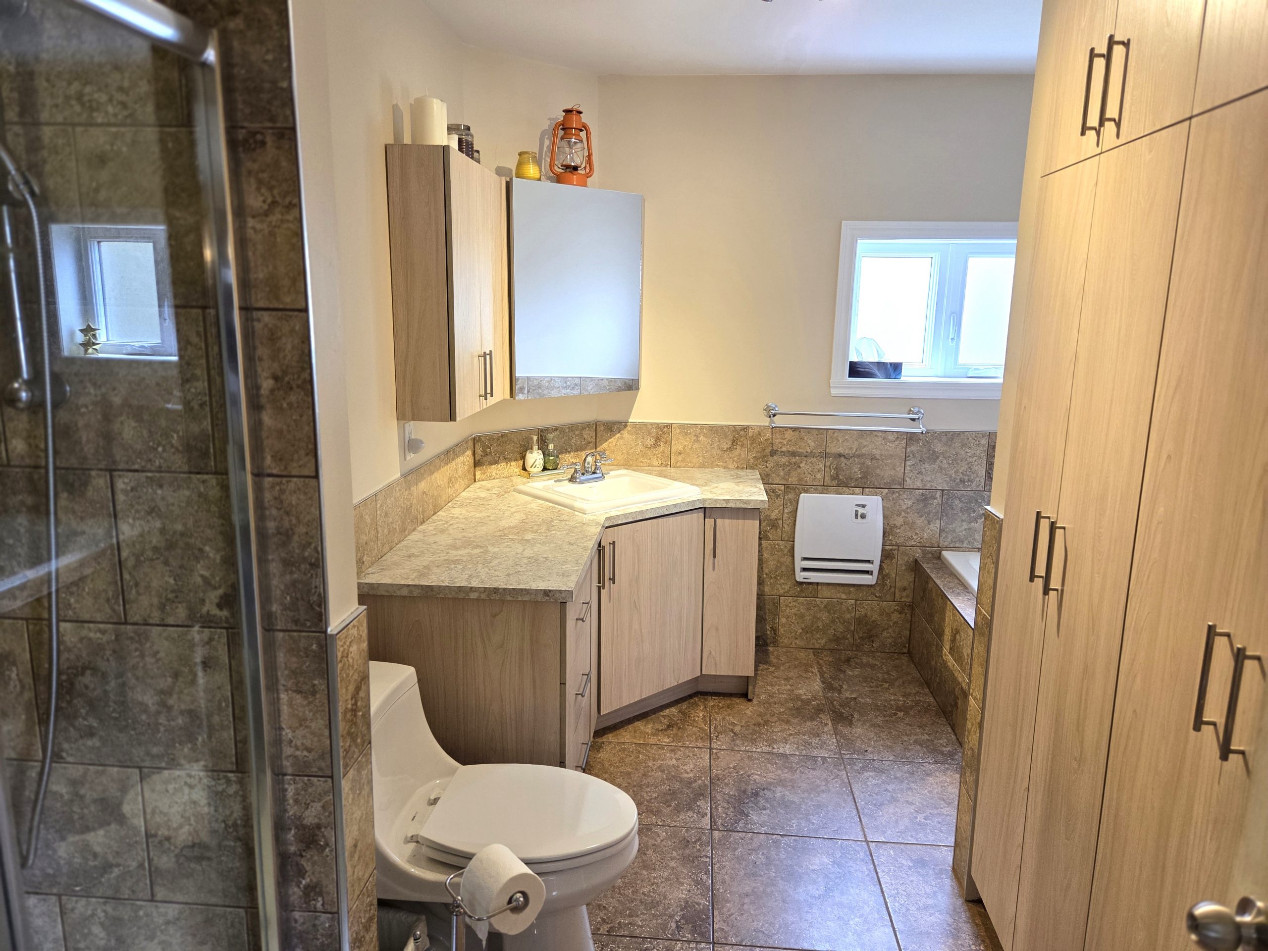 – La salle de bain refait au complet et les pièces du r.c ont été redimensionner.